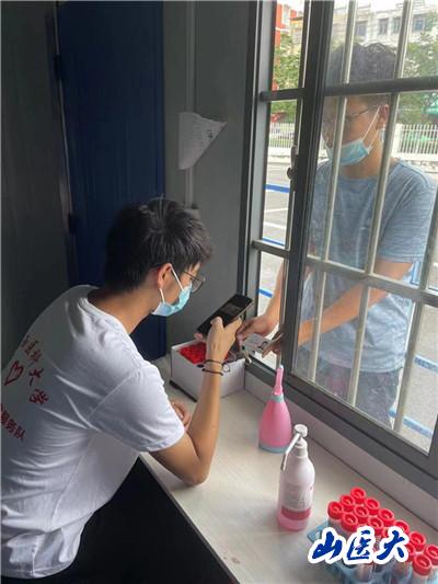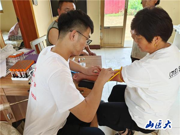 下午,队员们进入了社区街道办公室内对返并的省内省外人员进行登记,认真摸排其行程轨迹,严格落实疫情防控政策,共同守护来之不易的防疫成果。随后,队员们对社区的老人进行了免费抽血检查,不仅学会了如何使用仪器进行采血,也通过实践活动真切的深入到基层组织和群众中,了解到了如今人们的生活在中国共产党的领导下变得越来越好,明白了身为青年学生、山医学生肩负的重任。