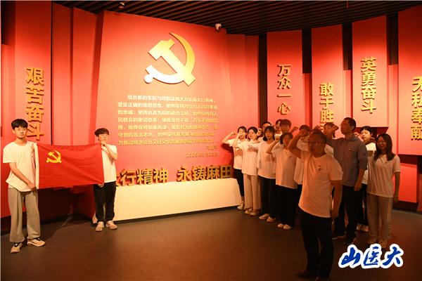 6月24日上午,实践队来到麻田镇八路军总部旧址纪念馆。一幅幅历史图片、一件件珍贵实物将我们的思绪拉回了那个战火纷飞的抗战时期。同志们恭默守静,神情严肃,身临其境的感受邓小平、彭德怀、左权、刘伯承等老一辈无产阶级革命家们和先烈们为争取民族解放而艰苦奋斗的无畏精神,发扬老一辈革命家大无畏精神和密切联系群众的优良传统作风,弘扬以爱国主义为核心的民族精神。在麻田八路军总部纪念馆第九展厅,实践队中的党员、预备党员佩戴党员党徽,与入党积极分子一同重温入党誓词。