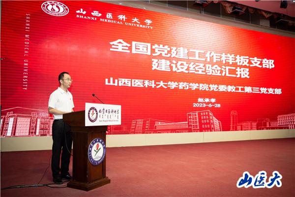 赵承孝作大会报告,分享全国党建工作样板支部建设经验。在校党委和学院党委的领导下,药学院党委教工第三党支部以党建示范创建、质量创优为指引,以“党员提升自身素质、服务广大群众”为目标,认真贯彻执行党的路线方针政策,持续强化功能,改进工作方式,创新活动内容,构建“1561党建机制”,以党建为引领,开展教学、科研、思政、科普、育人工作,着力提升服务师生的能力和服务质量,结合支部建设情况及创新做法,作较为详细的介绍。